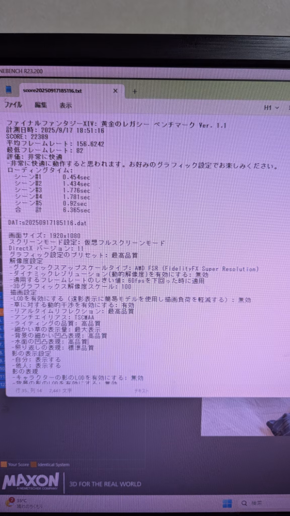 FF14 FHD 最高画質22389 平均フレームレート 156