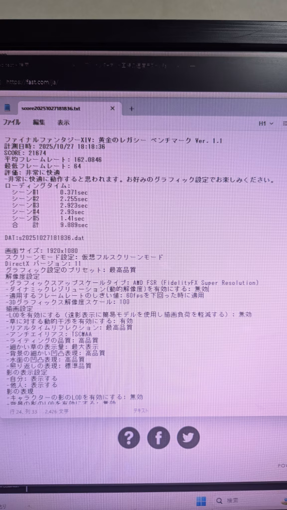 FF14 FHD 最高画質21674 平均フレームレート 162