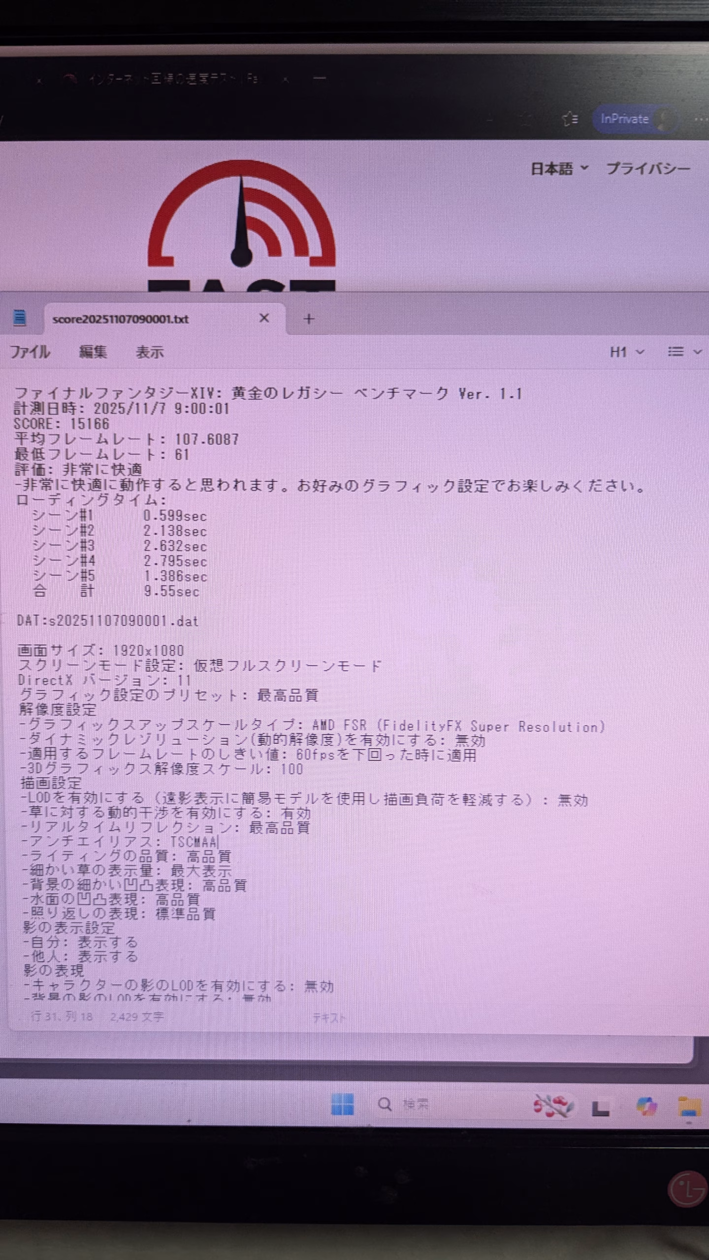 FF14 FHD 最高画質15166 平均フレームレート 107