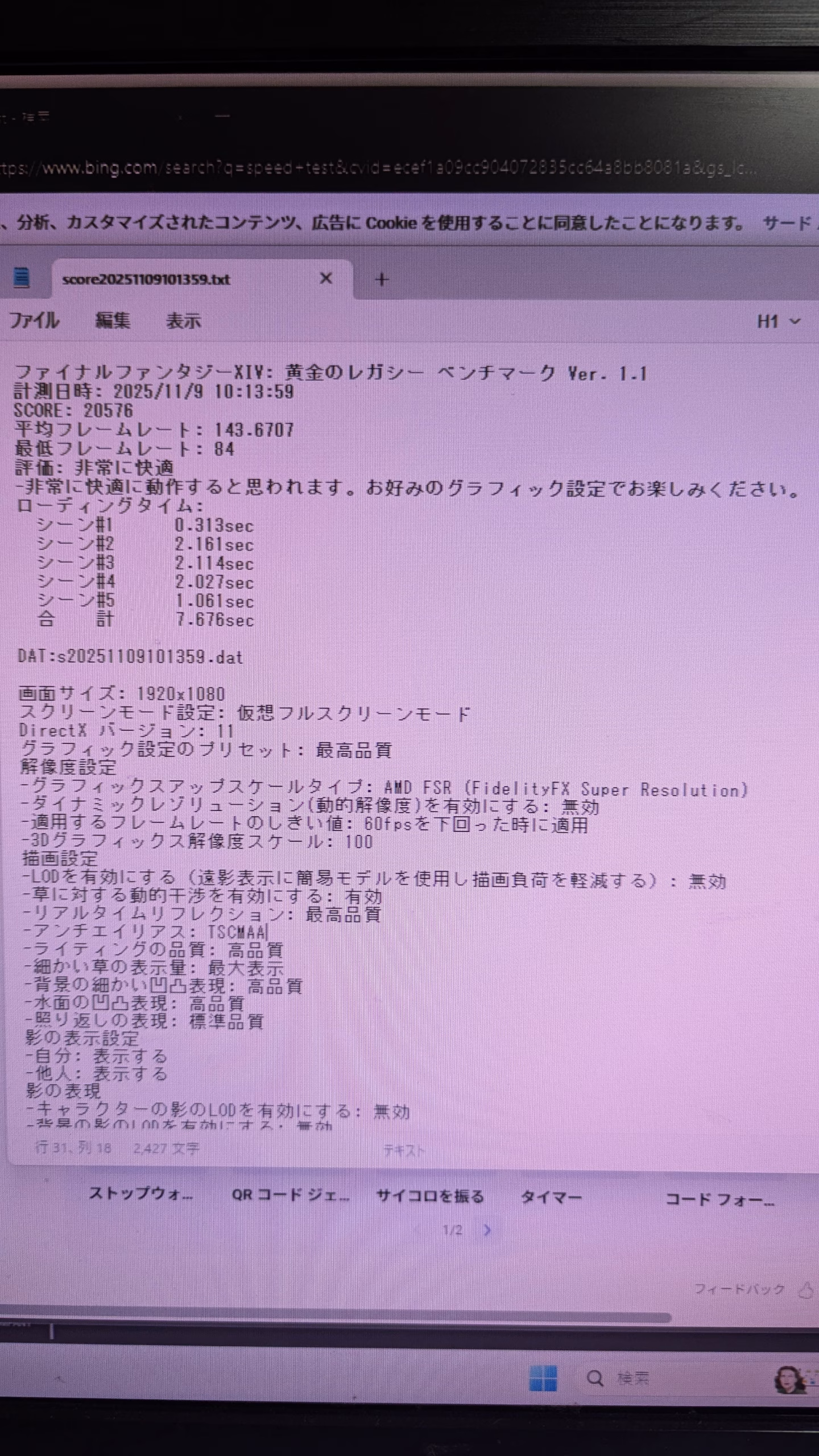 FF14 FHD 最高画質20576 平均フレームレート 143