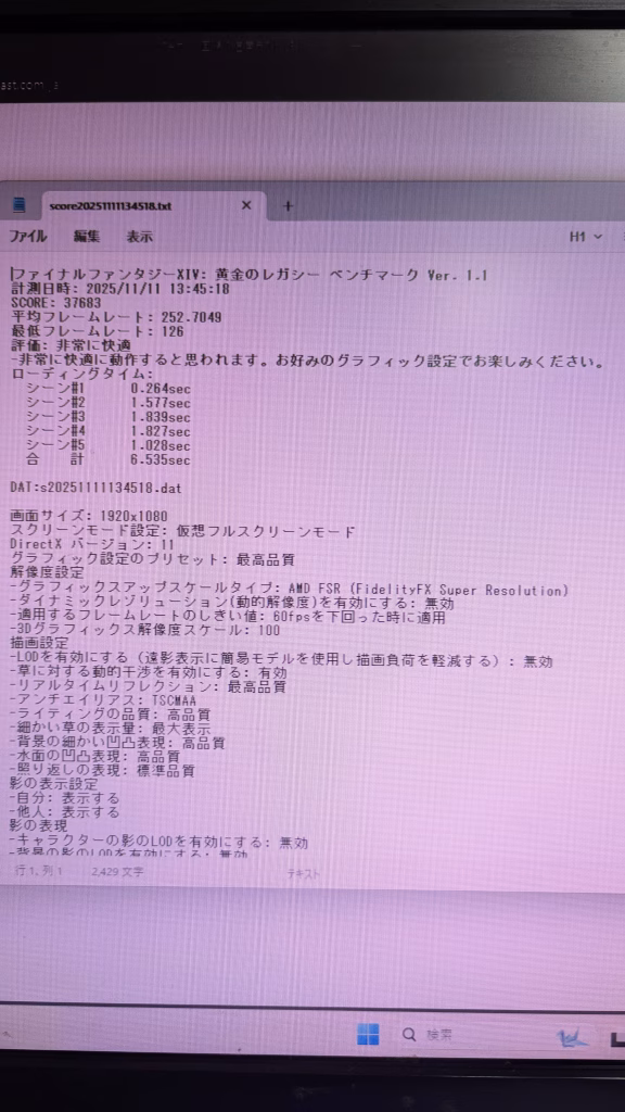 FF14 FHD 最高画質37683 平均フレームレート 252