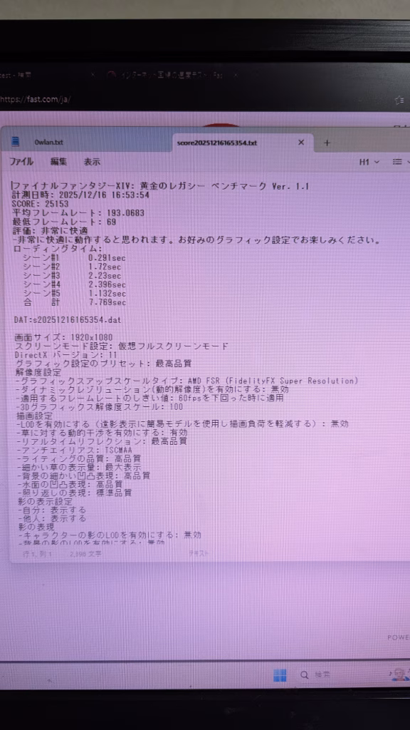 FF14 FHD 最高画質25153 平均フレームレート 193