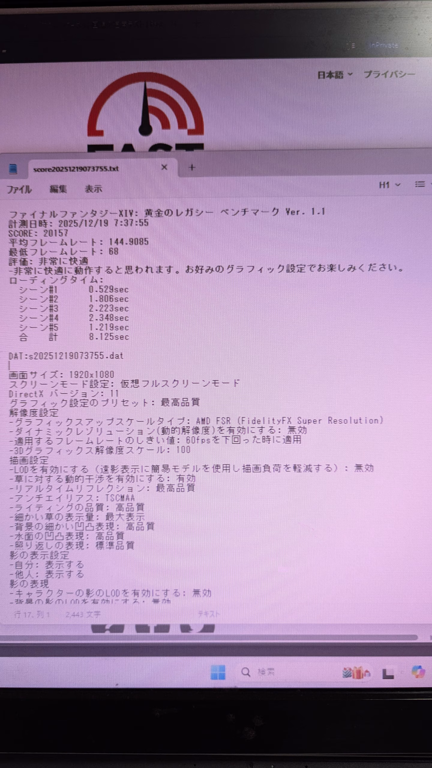 FF14 FHD 最高画質20157 平均フレームレート 144