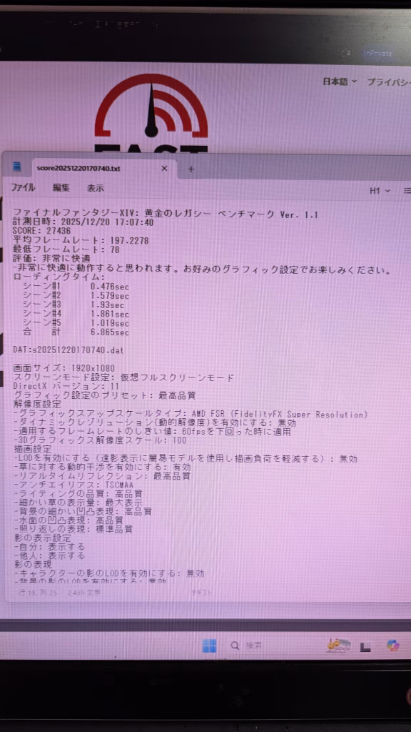 FF14 FHD 最高画質27436 平均フレームレート 197