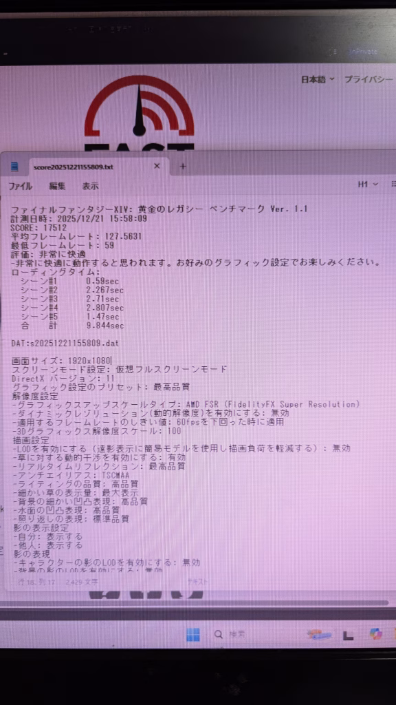 FF14 FHD 最高画質17512 平均フレームレート 127
