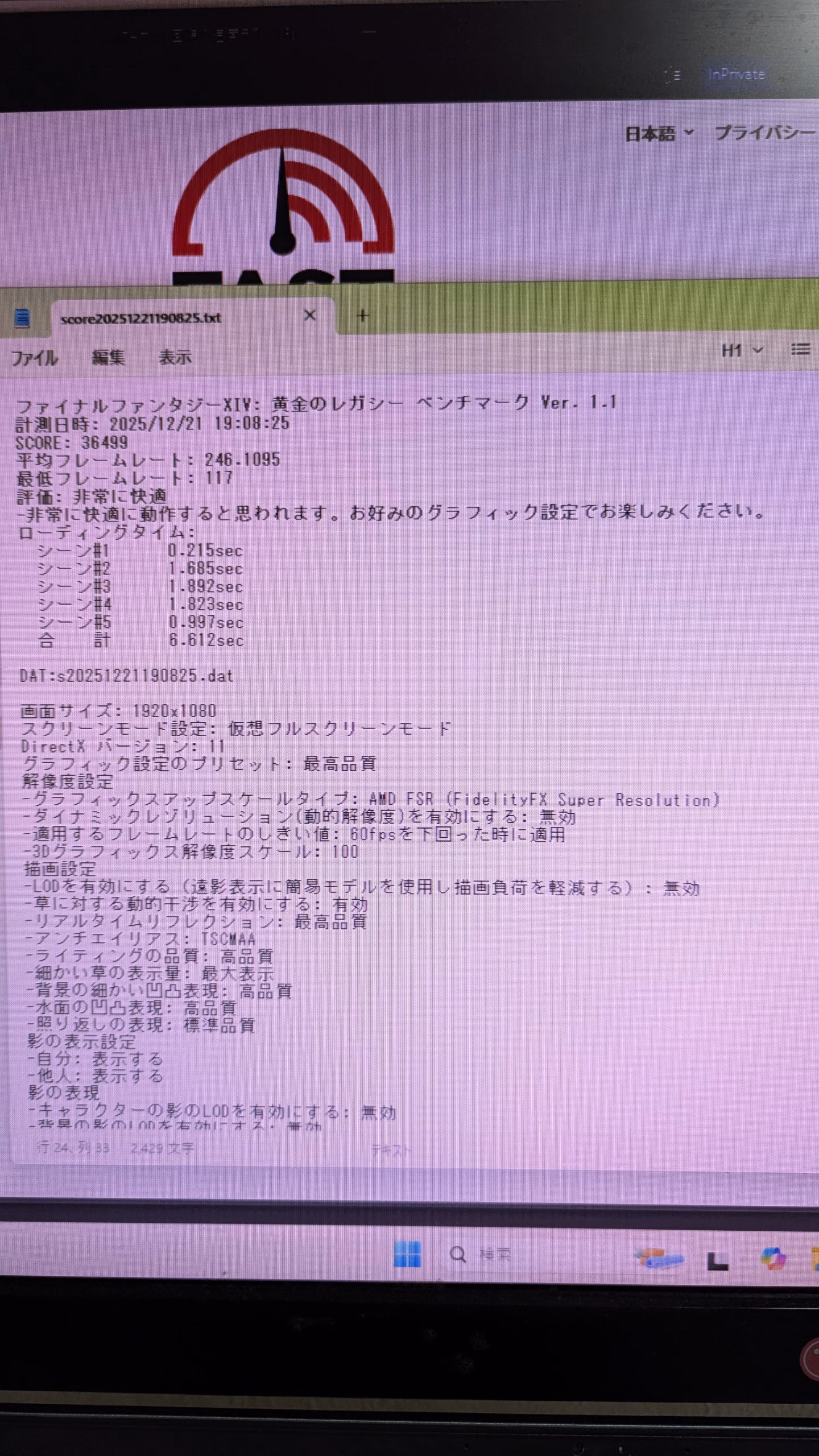 FF14 FHD 最高画質36499 平均フレームレート 246