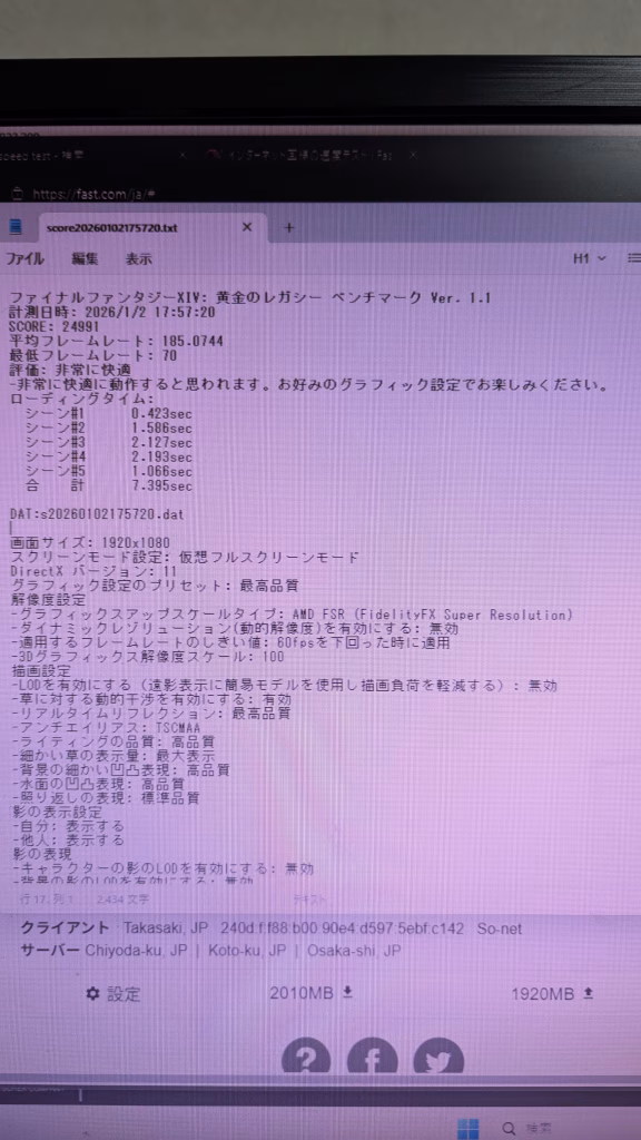 FF14 FHD 最高画質24991 平均フレームレート 185