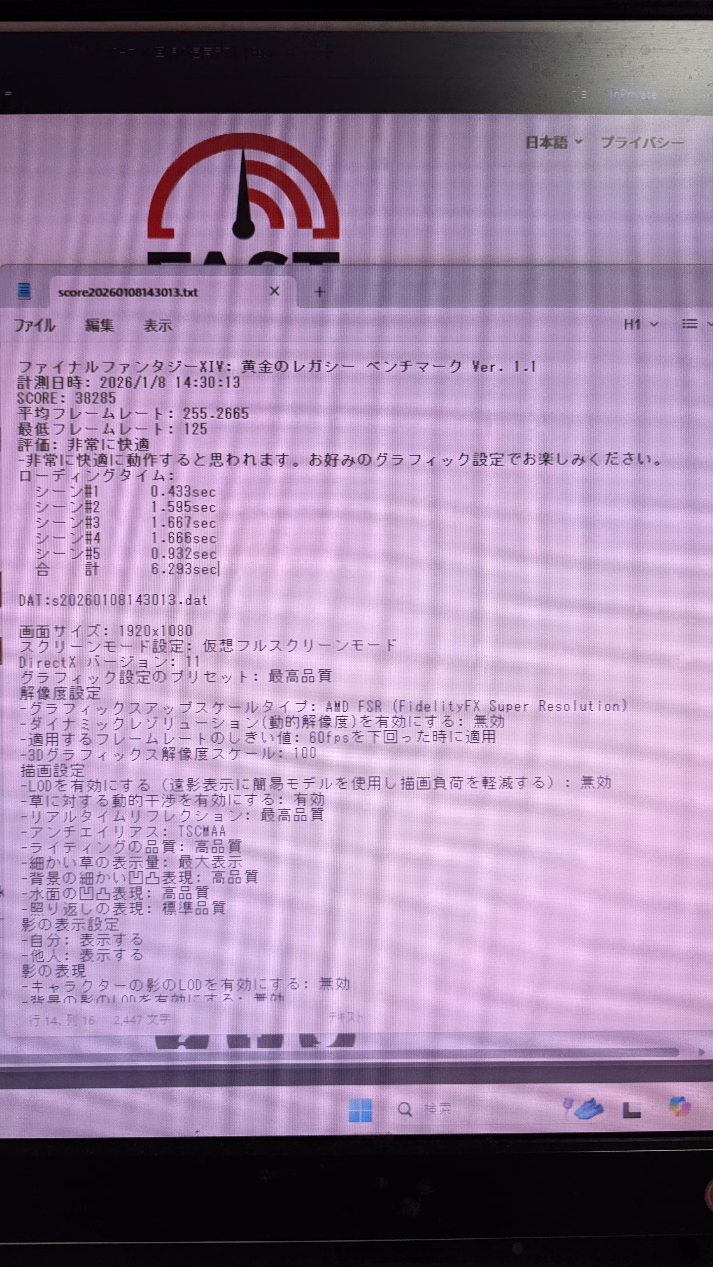 FF14 FHD 最高画質38285 平均フレームレート 255