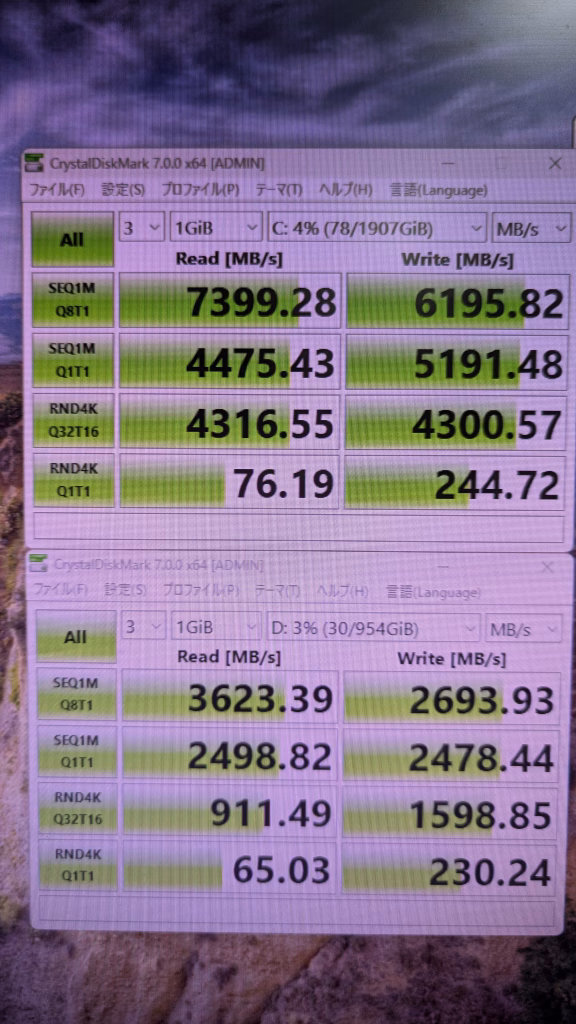 ストレージ読み込み速度 SSD 7399 3623 HDDは省略