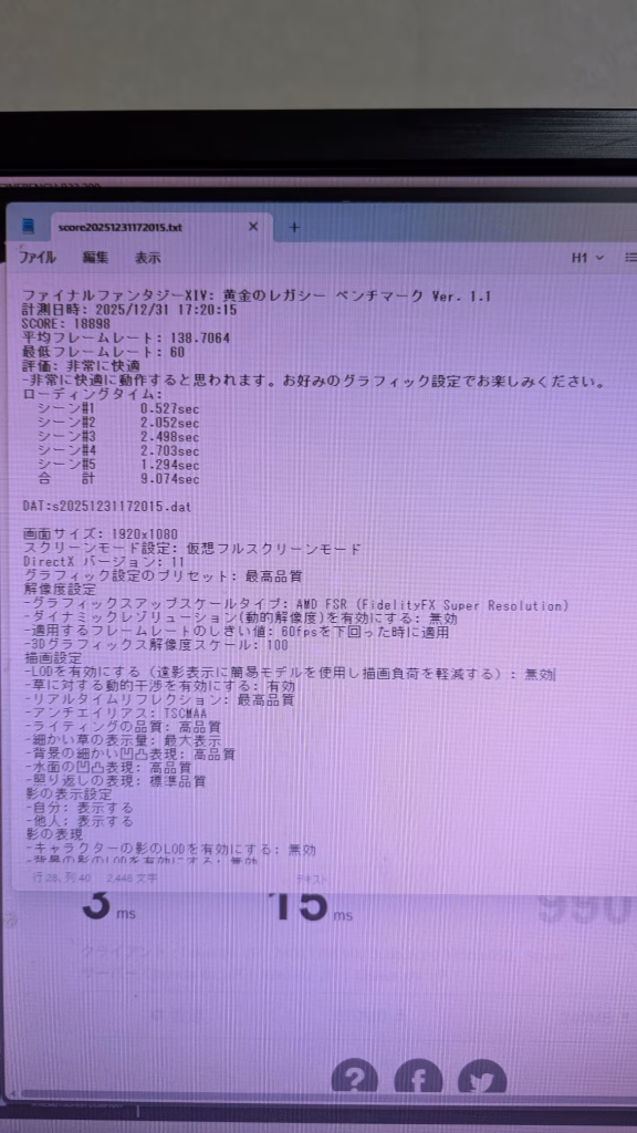 FF14 FHD 最高画質18898 平均フレームレート 138