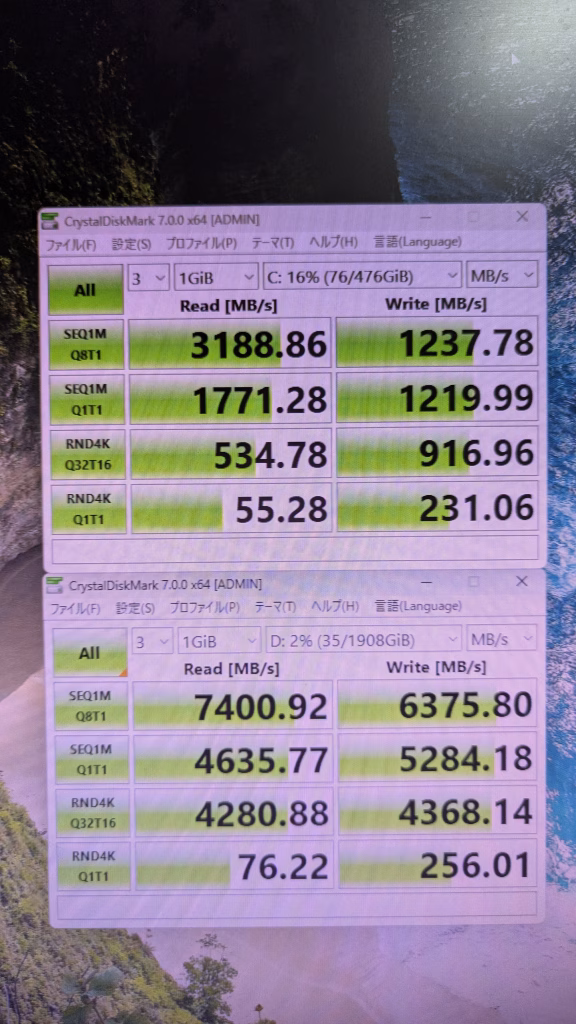 ストレージ読み込み速度 SSD 3188 7400 HDDは省略