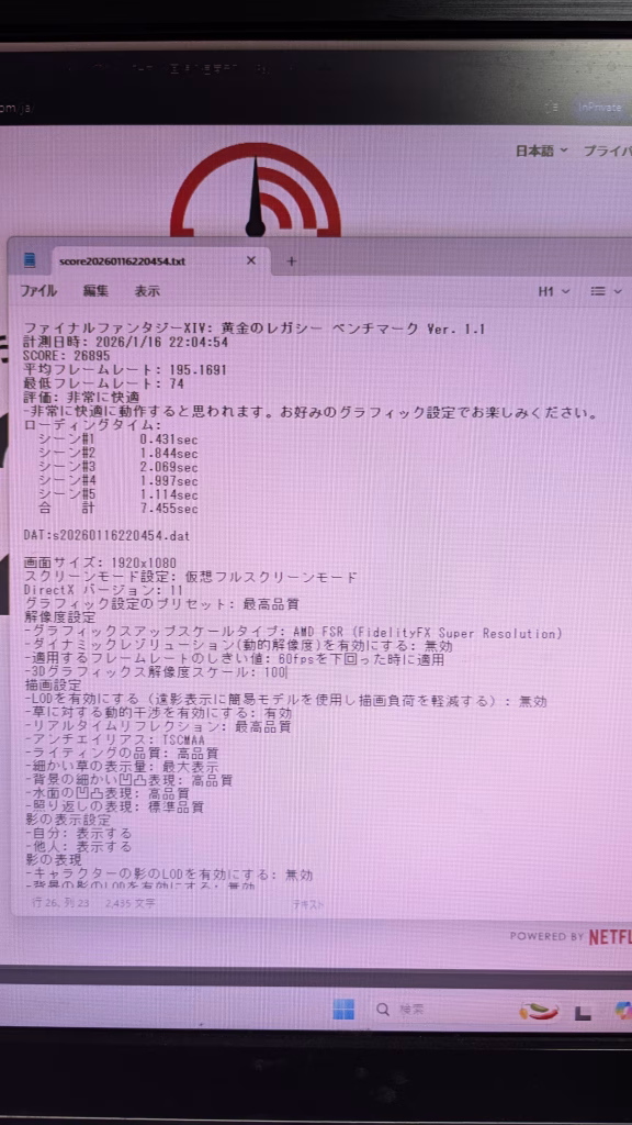 FF14 FHD 最高画質26895 平均フレームレート 195