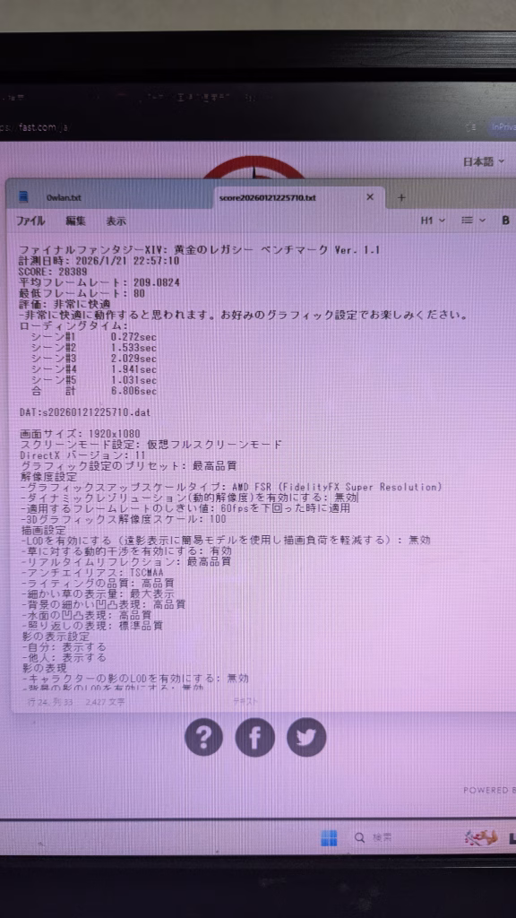 FF14 FHD 最高画質28389 平均フレームレート 209