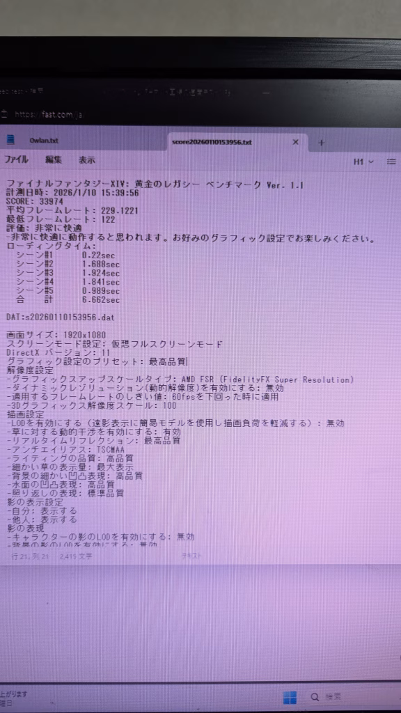FF14 FHD 最高画質33974 平均フレームレート 229