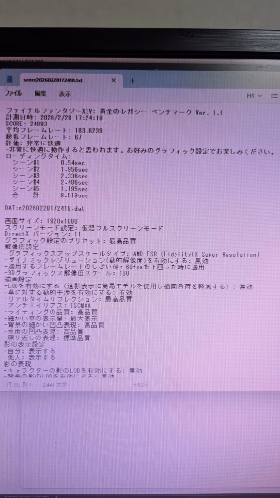 FF14 FHD 最高画質24893 平均フレームレート 183