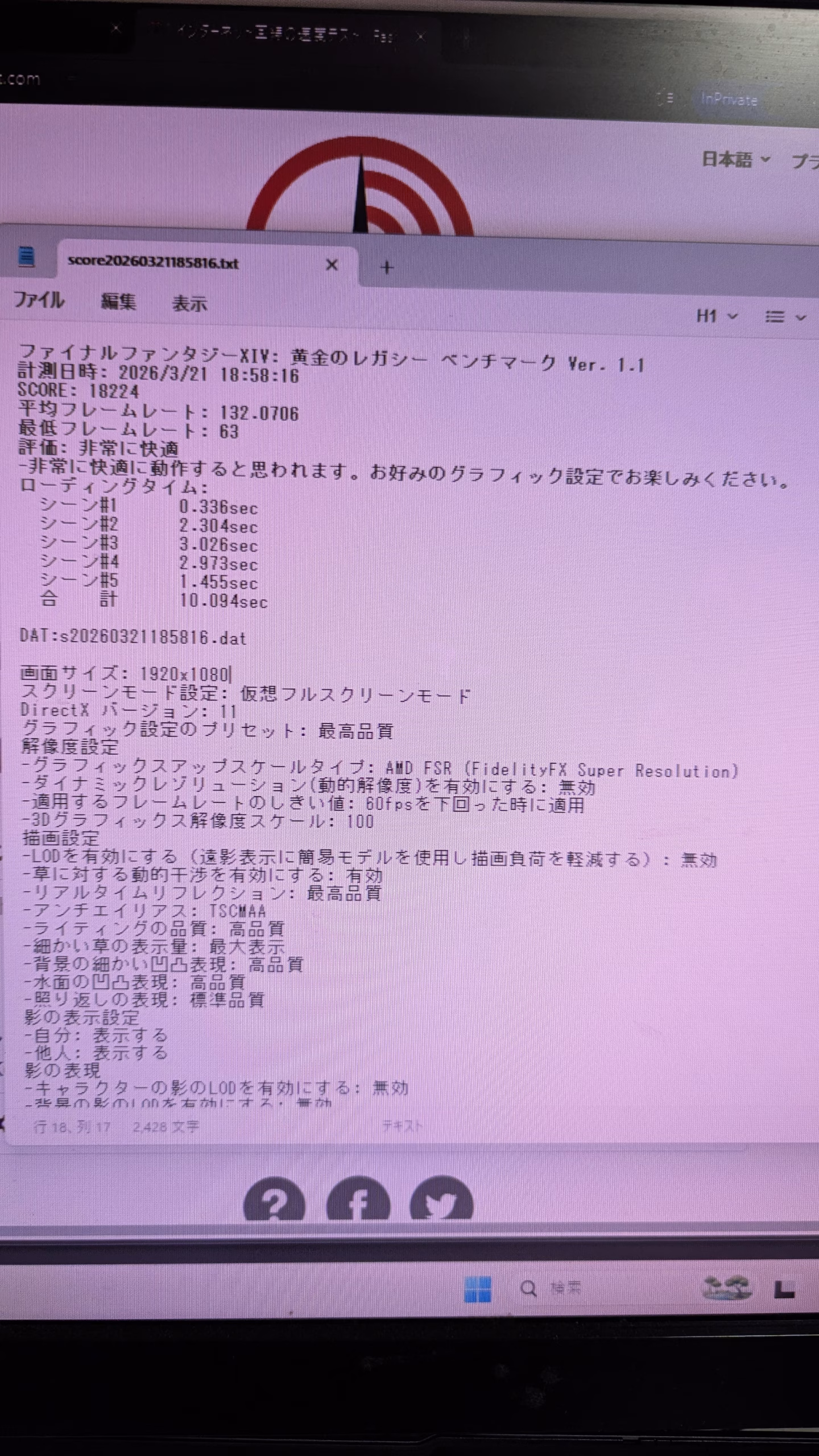 FF14 FHD 最高画質18224 平均フレームレート 132