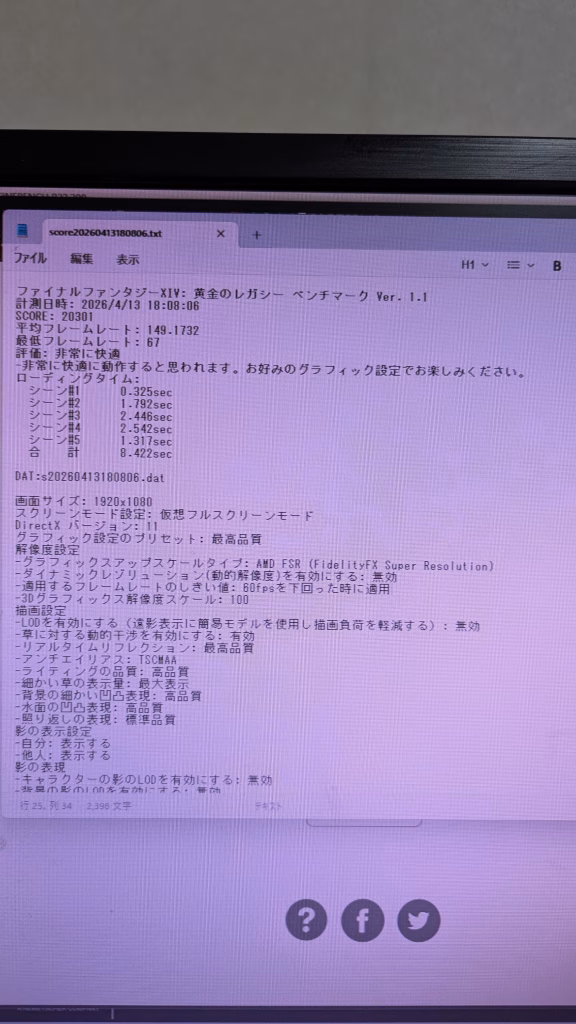 FF14 FHD 最高画質20301 平均フレームレート 149