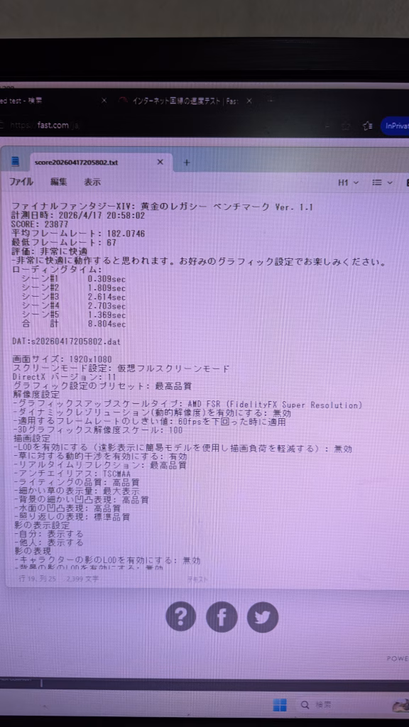 FF14 FHD 最高画質23877 平均フレームレート 182